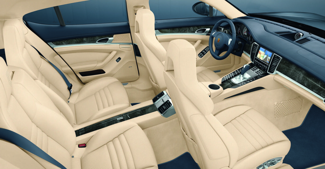 Z konsolą środkową poprowadzoną od tablicy rozdzielczej do tylnych siedzeń czterodrzwiowy Gran Turismo oferuje na wszystkich czterech miejscach siedzących całkowicie nowe poczucie przestrzeni. Wnętrze tworzy doskonałe pod względem ergonomicznym warunki dla kierowcy, a ponadto podkreśla osobiste otoczenie każdego z pasażerów podróżujących na pojedynczych fotelach. Niska pozycja siedząca i sportowa płaska kierownica dają kierowcy typowy dla Porsche bezpośredni kontakt z drogą. Obok tych klasycznych wartości Panamera oferuje liczne możliwości indywidualnego dostosowania wyposażenia wnętrza. Tapicerki z gładkiej i naturalnej skóry w 13 kombinacjach kolorystycznych i materiałowych wraz z czterema wersjami dwukolorowymi mogą być połączone z siedmioma opcjonalnymi rodzajami elementów dekoracyjnych, w tym z tak ekskluzywnych materiałów, jak carbon lub drewno „Olive Natur” z wyraźnie widocznymi porami.